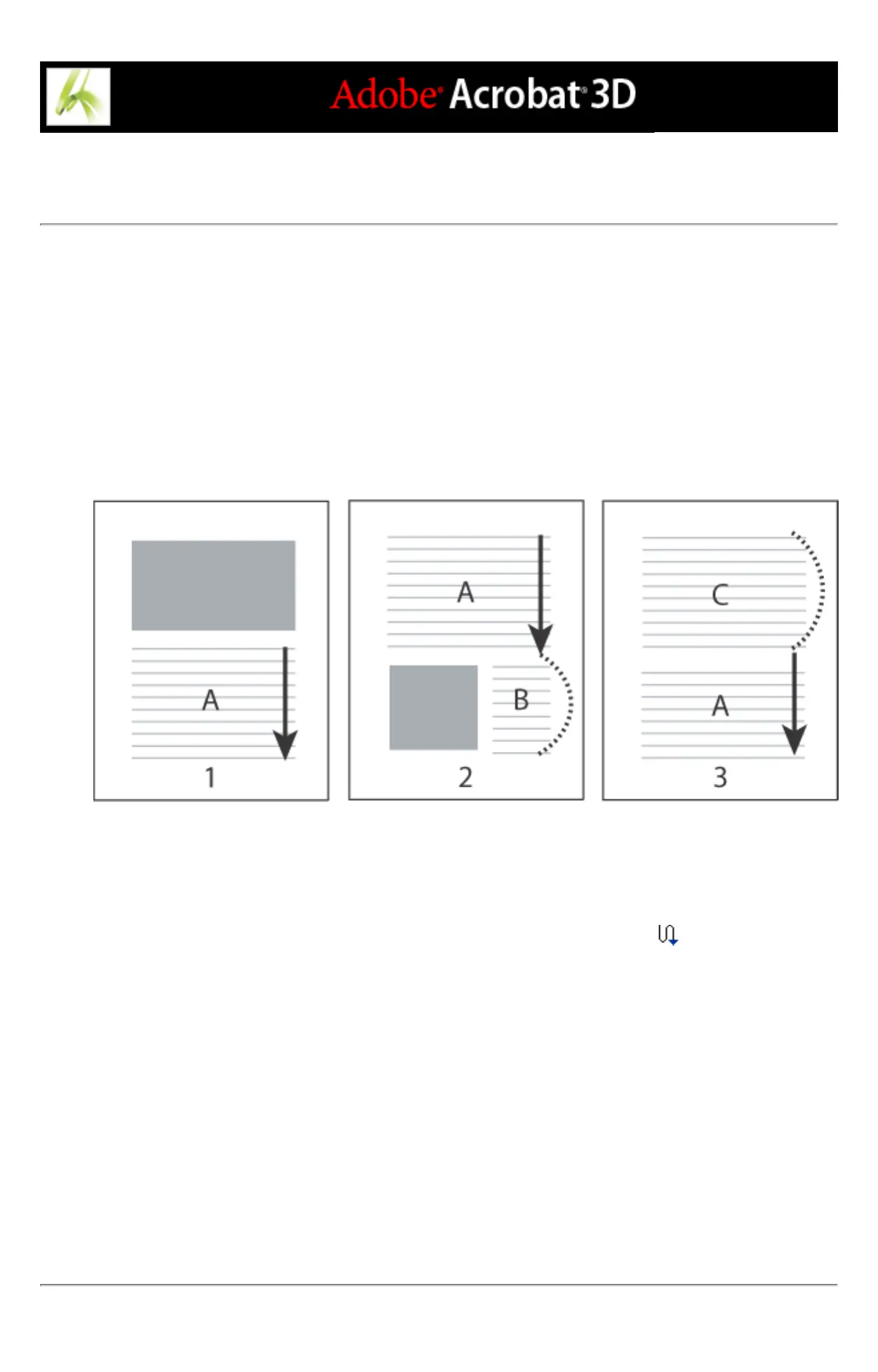 The flow of an article thread. The user reads through text A, skips text B and C, and moves on to text A