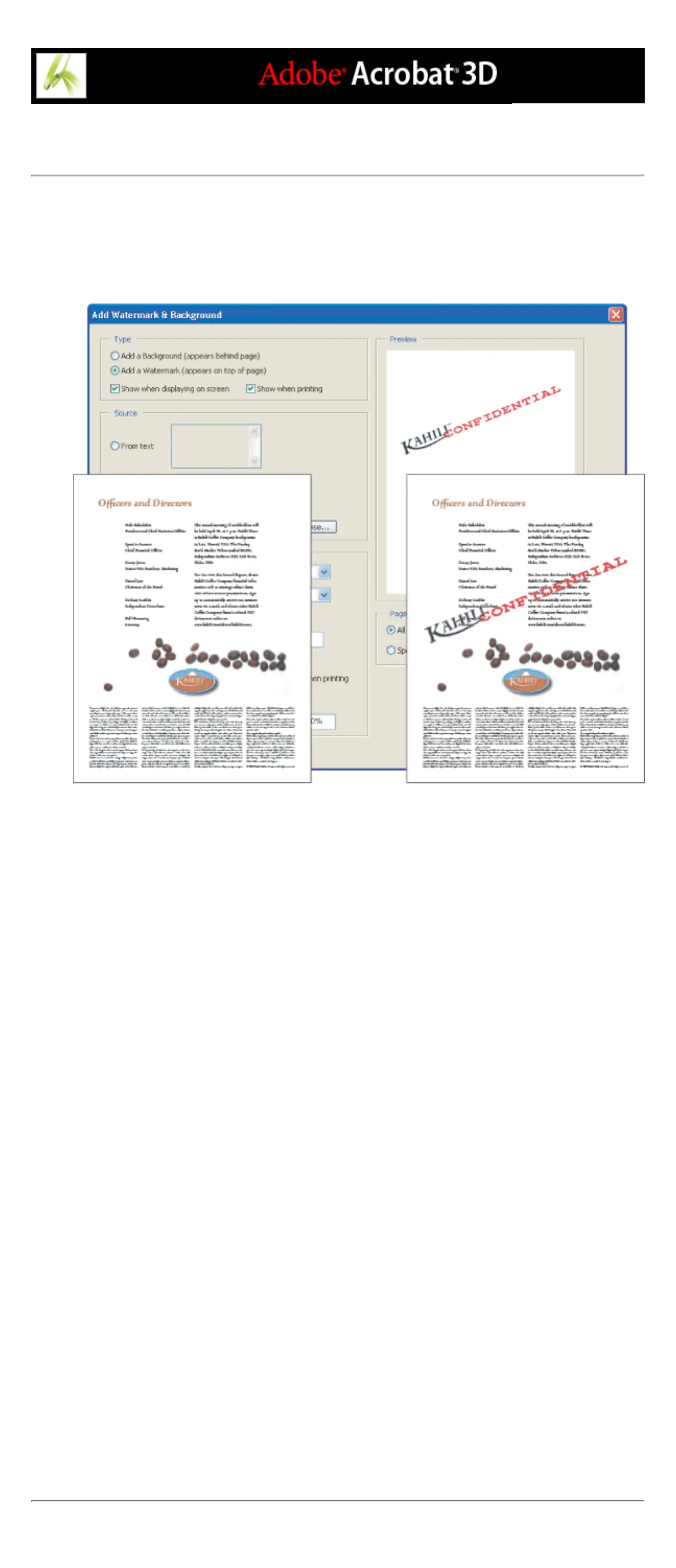 ● Add A Watermark to superimpose text, an image, or effect over text and images on the page.
