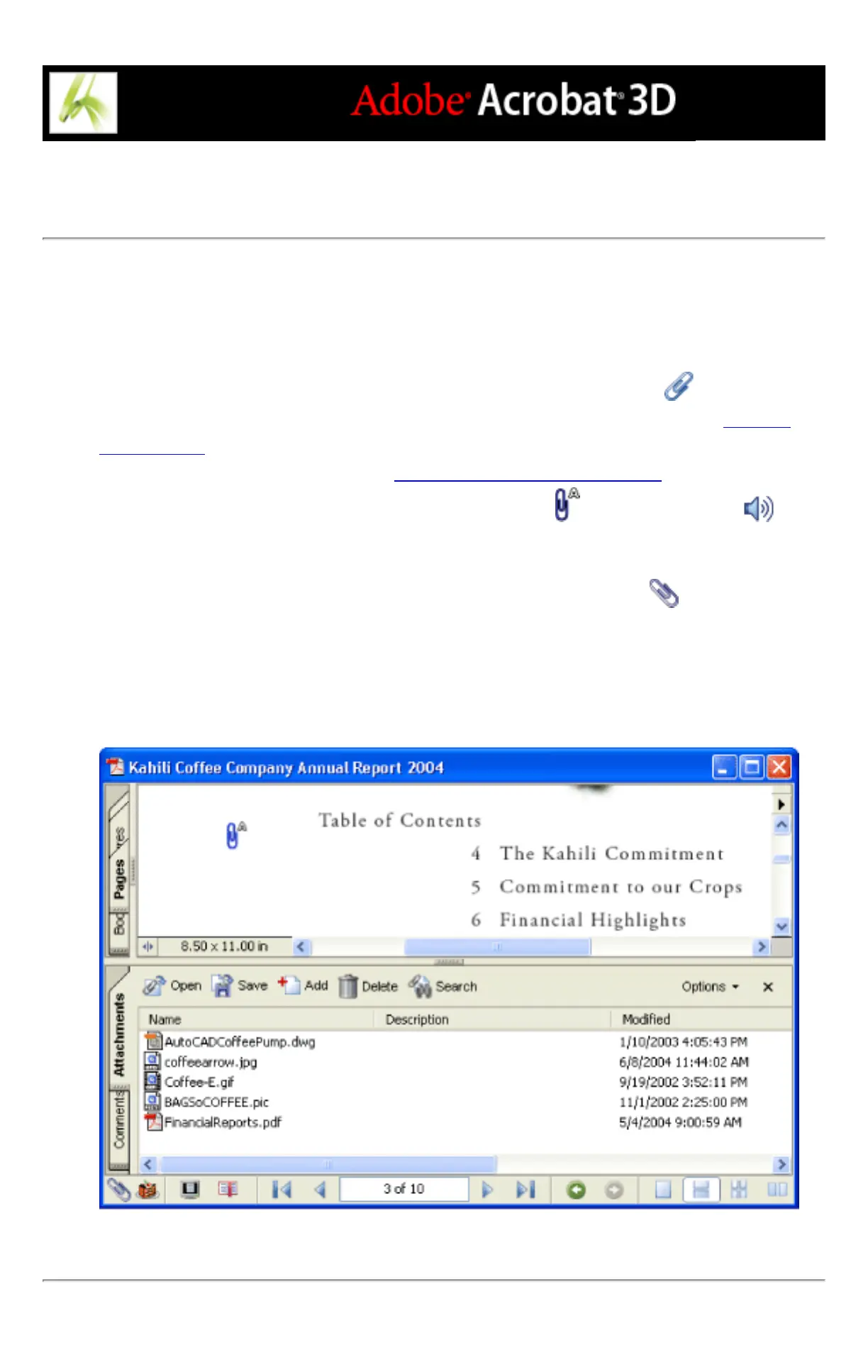 pointer over the icon. The Attachments tab lists all the attachments in the PDF document,