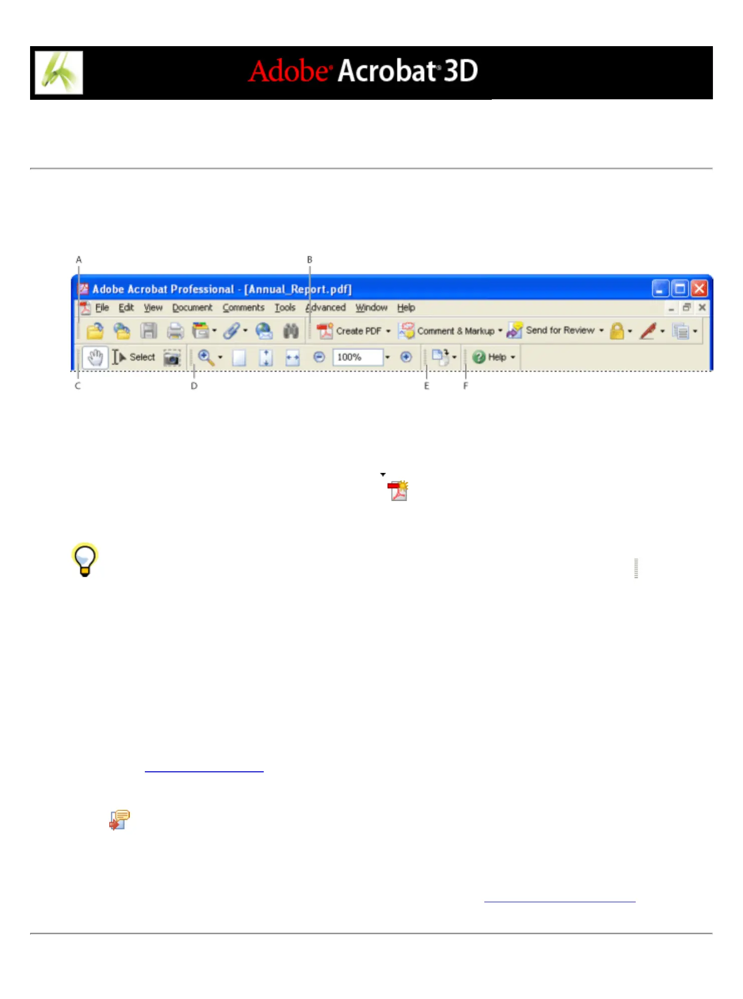 Toolbars open by default A. File toolbar B. Tasks toolbar C. Basic toolbar D. Zoom toolbar E. Rotate View toolbar F.