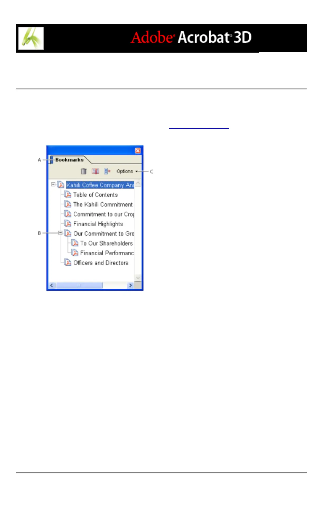 Bookmarks tab A. Bookmarks tab B. Expanded bookmark C. Click to display bookmark Options