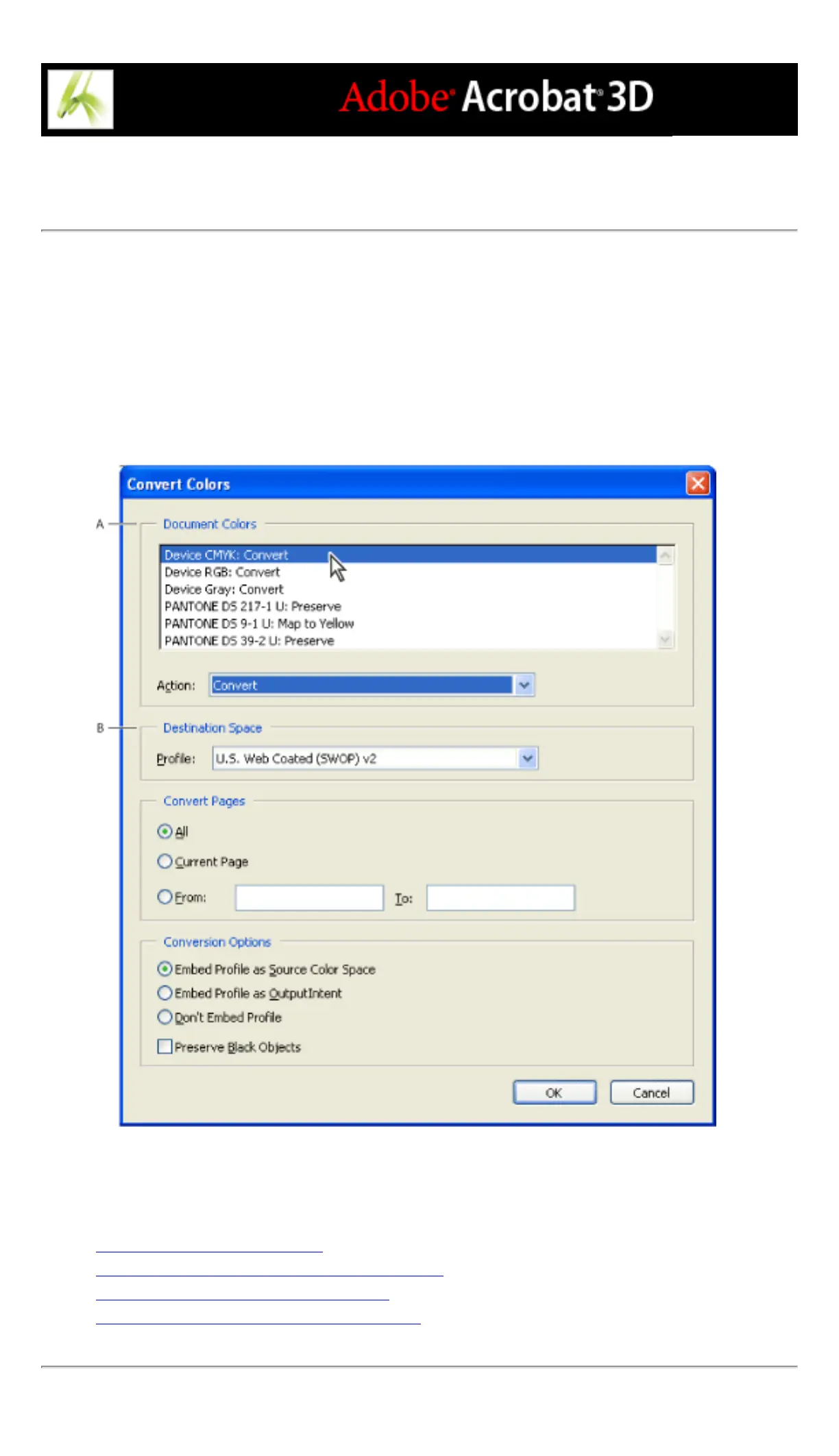 Convert Colors dialog box A. Document Colors list B. Destination Space color profiles