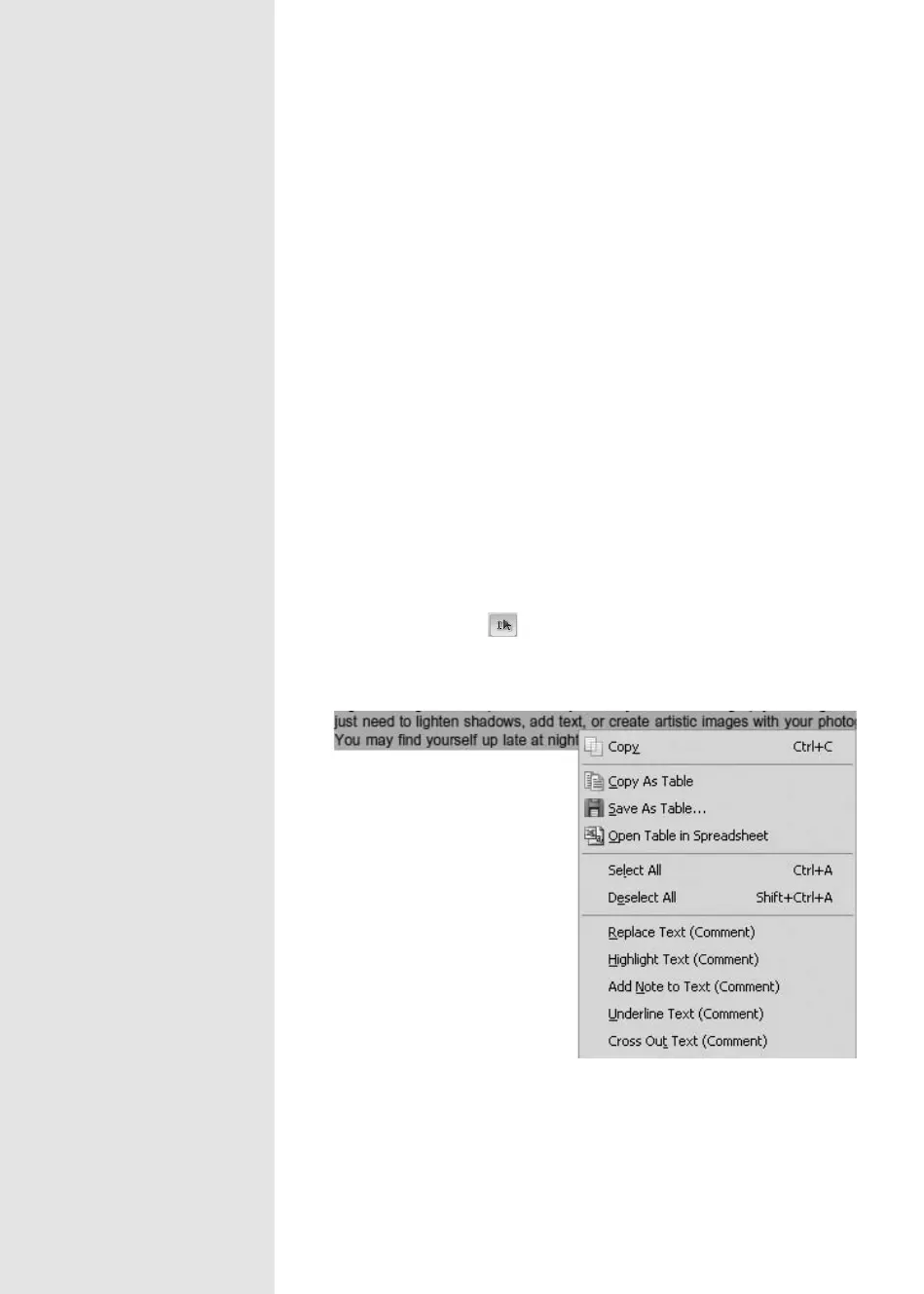 Figure 56 Select text in the document using the Select tool and choose content-