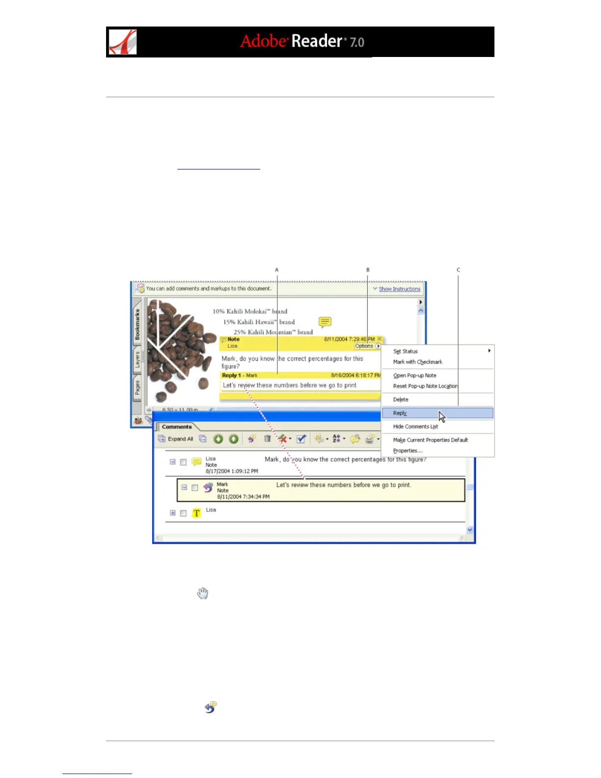 Note: If you use the Reply option to add text to the pop-up window of another reviewer's comment, your text is