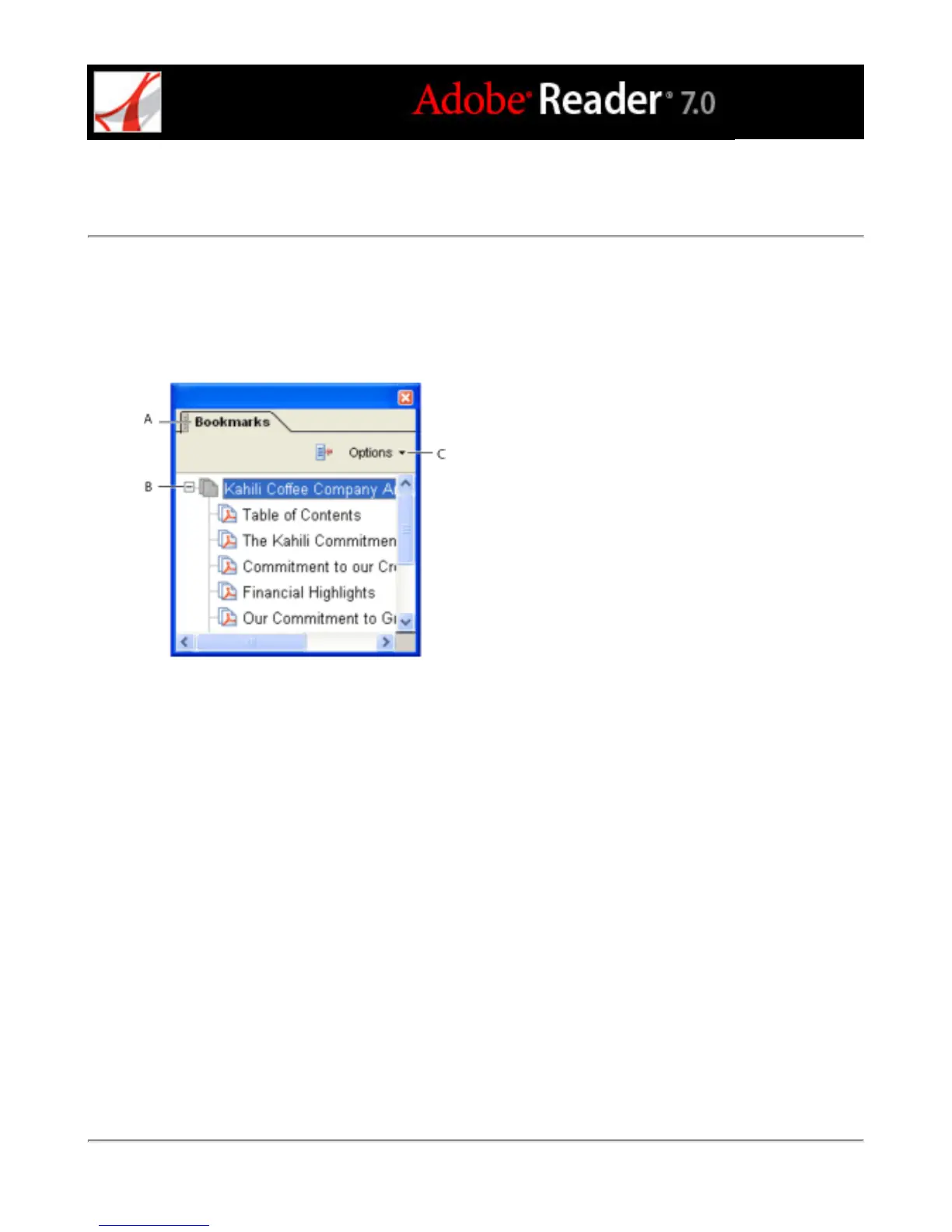 Bookmarks tab A. Bookmarks tab B. Expanded bookmark C. Click to display bookmark Options
