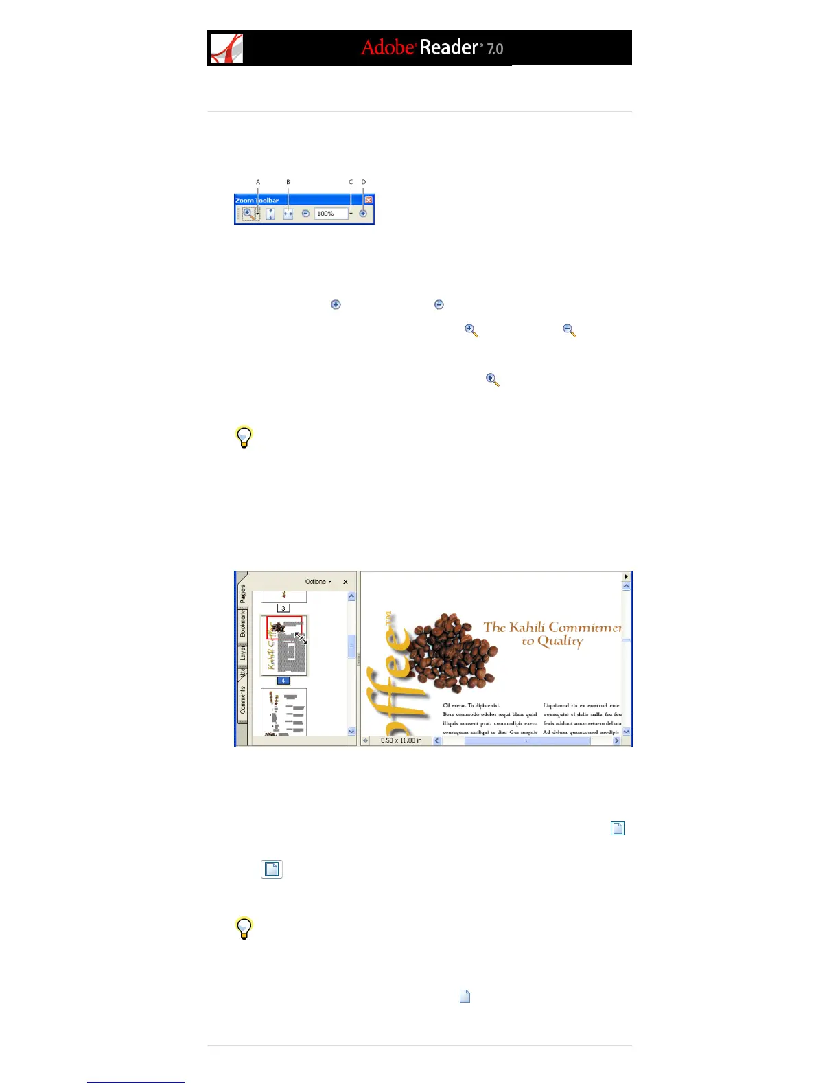 Magnification options on toolbar A. Zoom In tools B. Fit Width button C. Zoom menu D. Zoom In button