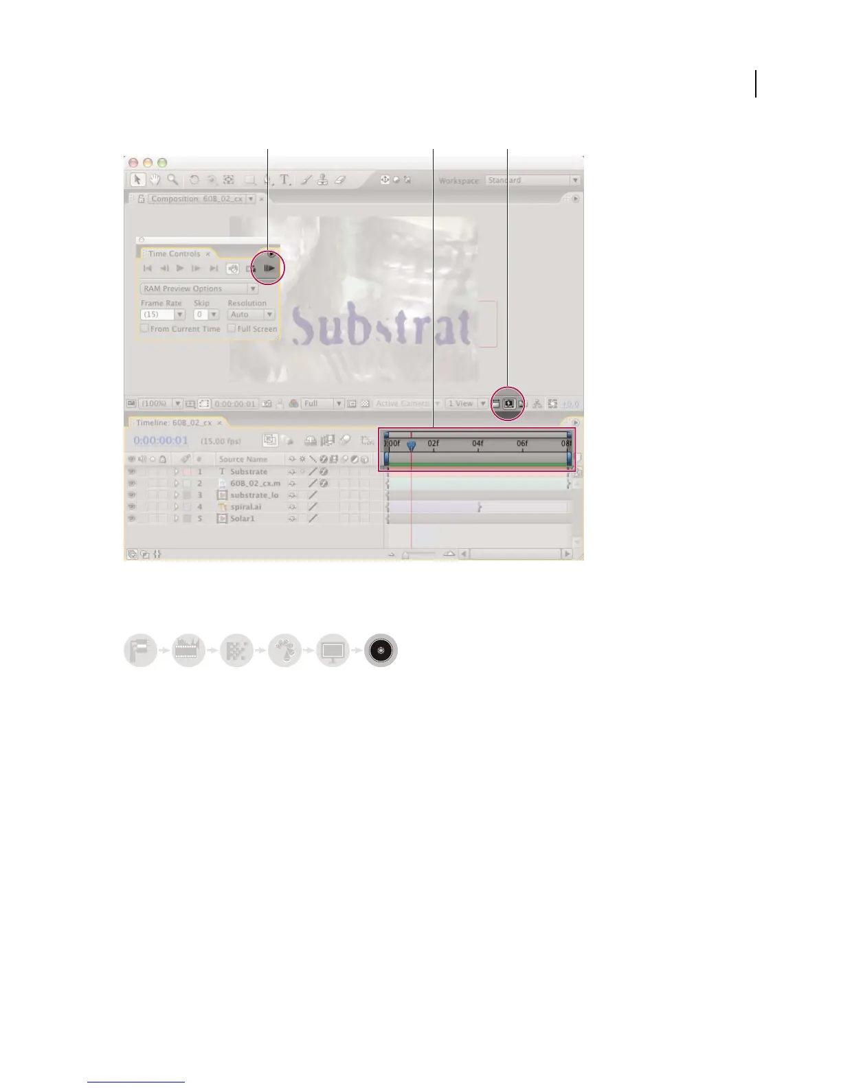 A. RAM preview in Time Controls panel B. Cache indicator in Timeline panel C. Fast Previews