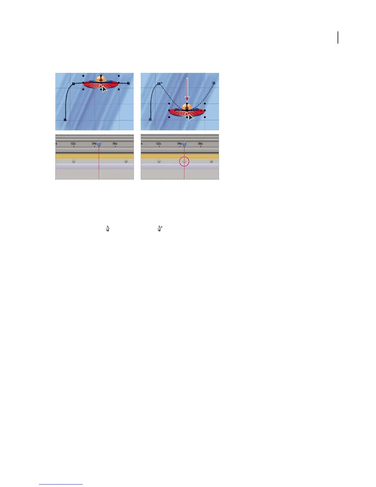 To add a keyframe to a motion path using the Pen tool