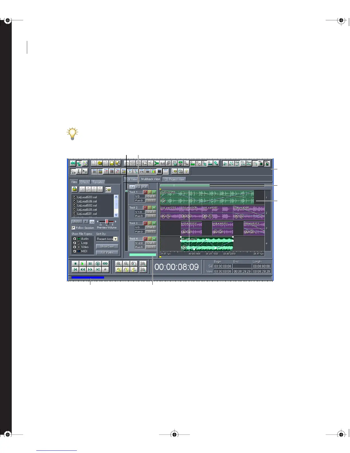 display lets you edit the clips in each track. (See “Working with clips” on page 168.)