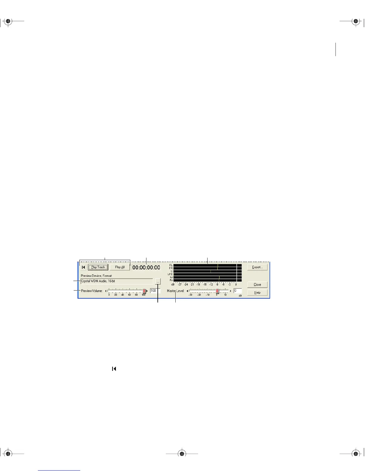 A. Transport controls B. Time indicator C. Output meters D. Preview device E. Preview volume