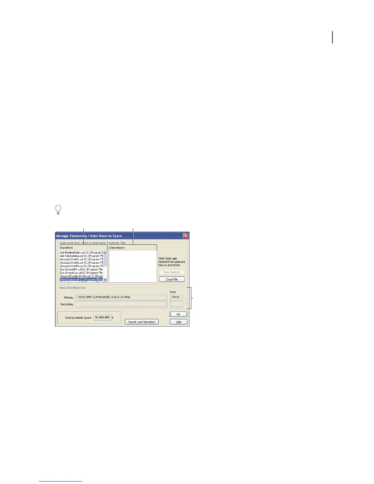 A. Open waveforms B. Undo items for the selected waveform C. Location of primary and secondary temporary folders