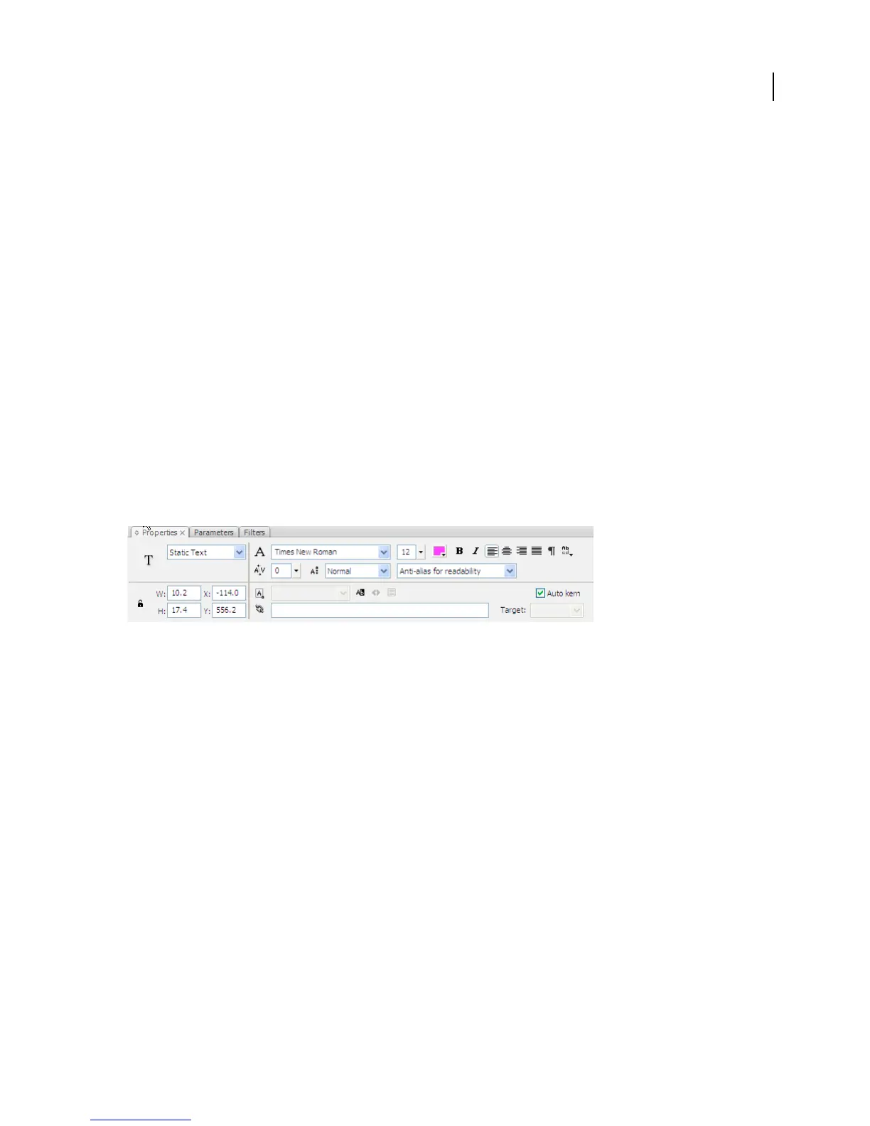 The Property inspector showing the properties for the Text tool