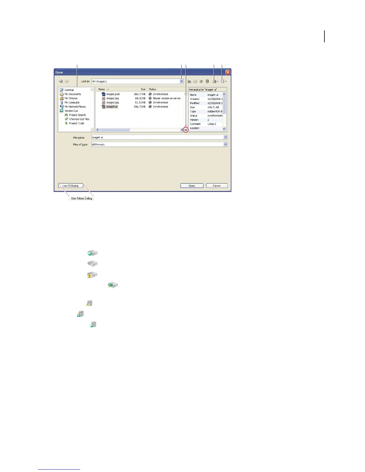 Bridge and the Adobe dialog box display status icons for Version Cue Servers and projects to let you know whether