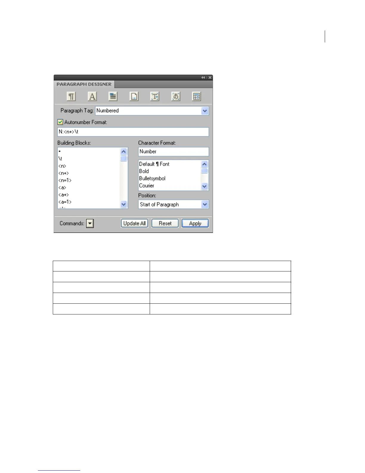 The Numbering properties are defined as follows in the Paragraph Designer.