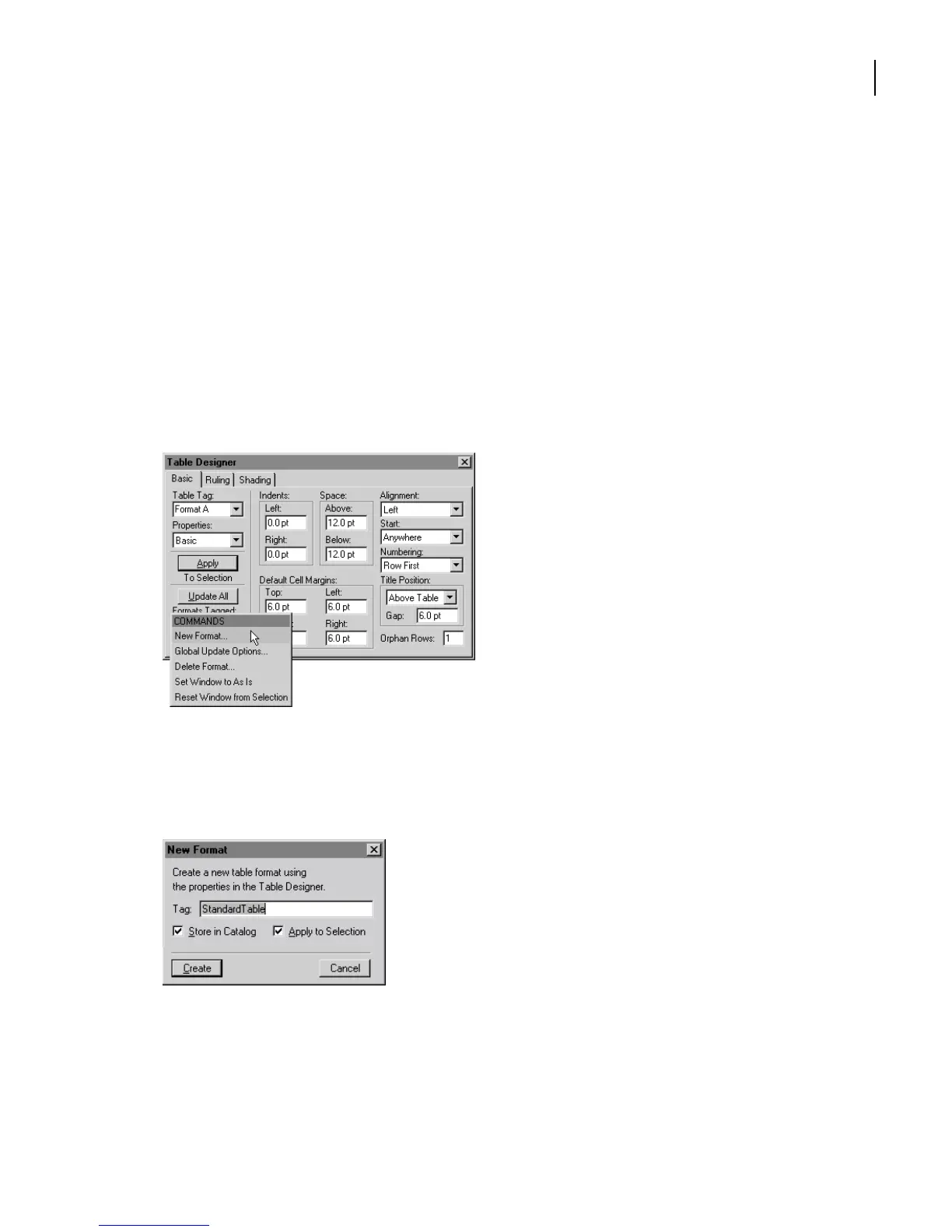 Like paragraph and character formats, you change table formats in a designer dialog box