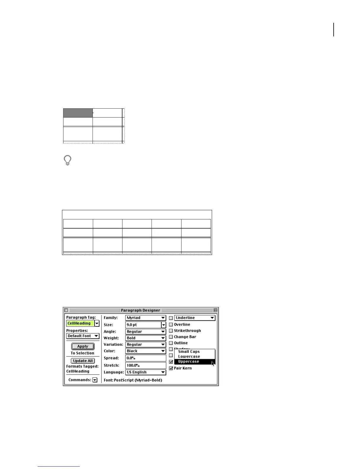 In the Paragraph Designer, choose Uppercase from the pop-up menu.