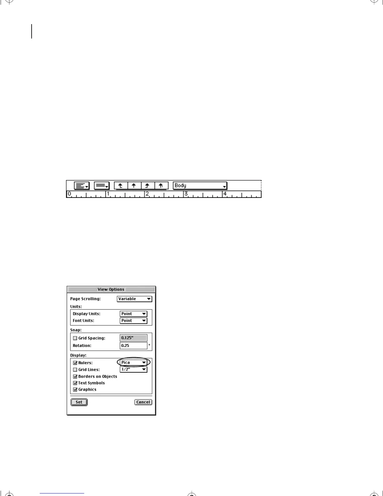 Choose Pica from the Rulers pop-up menu to change the ruler markings.