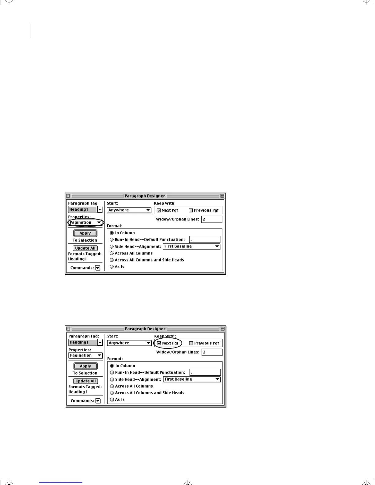 In the Paragraph Designer, choose Pagination from the Properties pop-up menu. (In