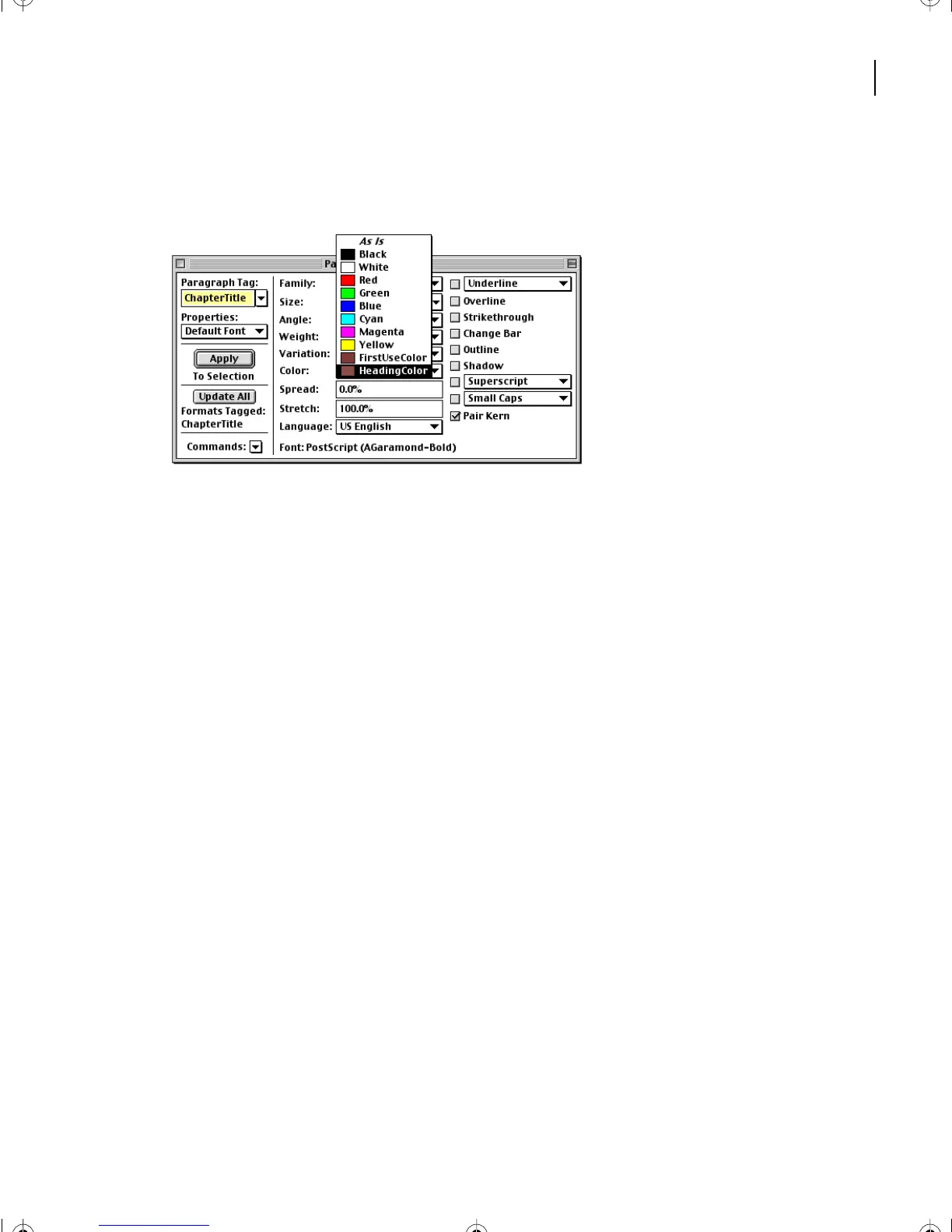 Choose HeadingColor from the Color pop-up menu and click Update All. The chapter