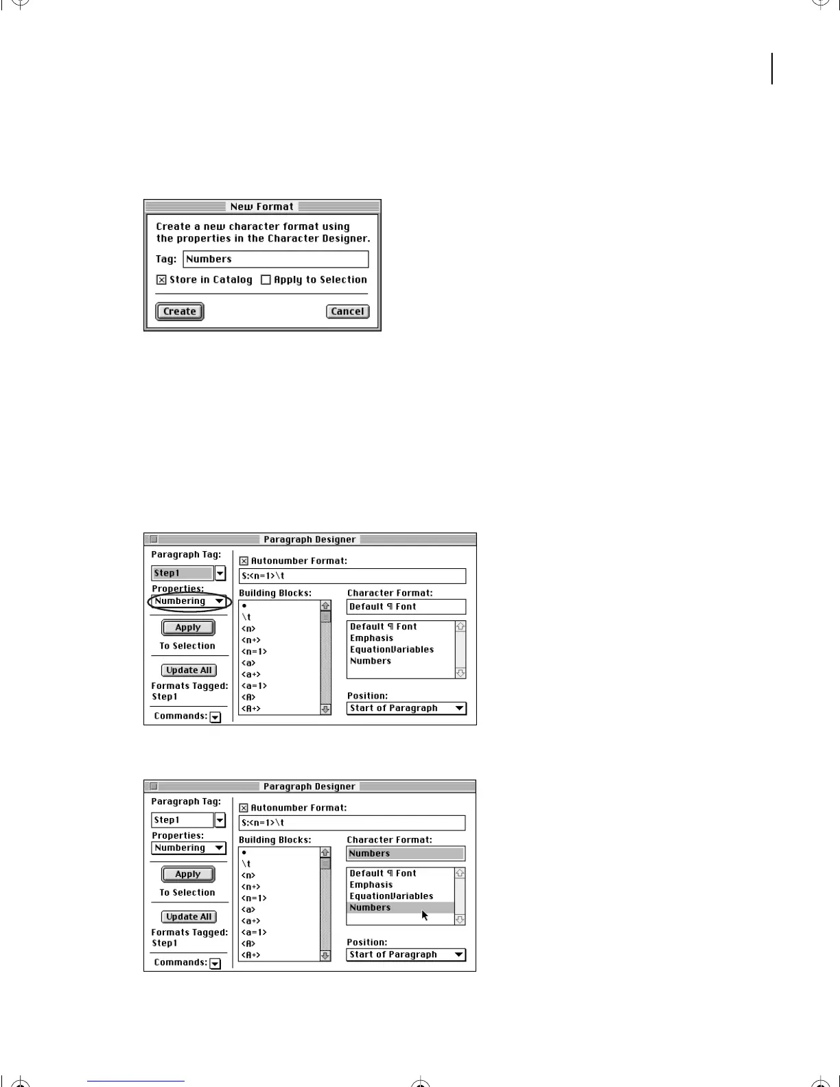 In the Paragraph Designer, choose Numbering from the Properties pop-up menu.