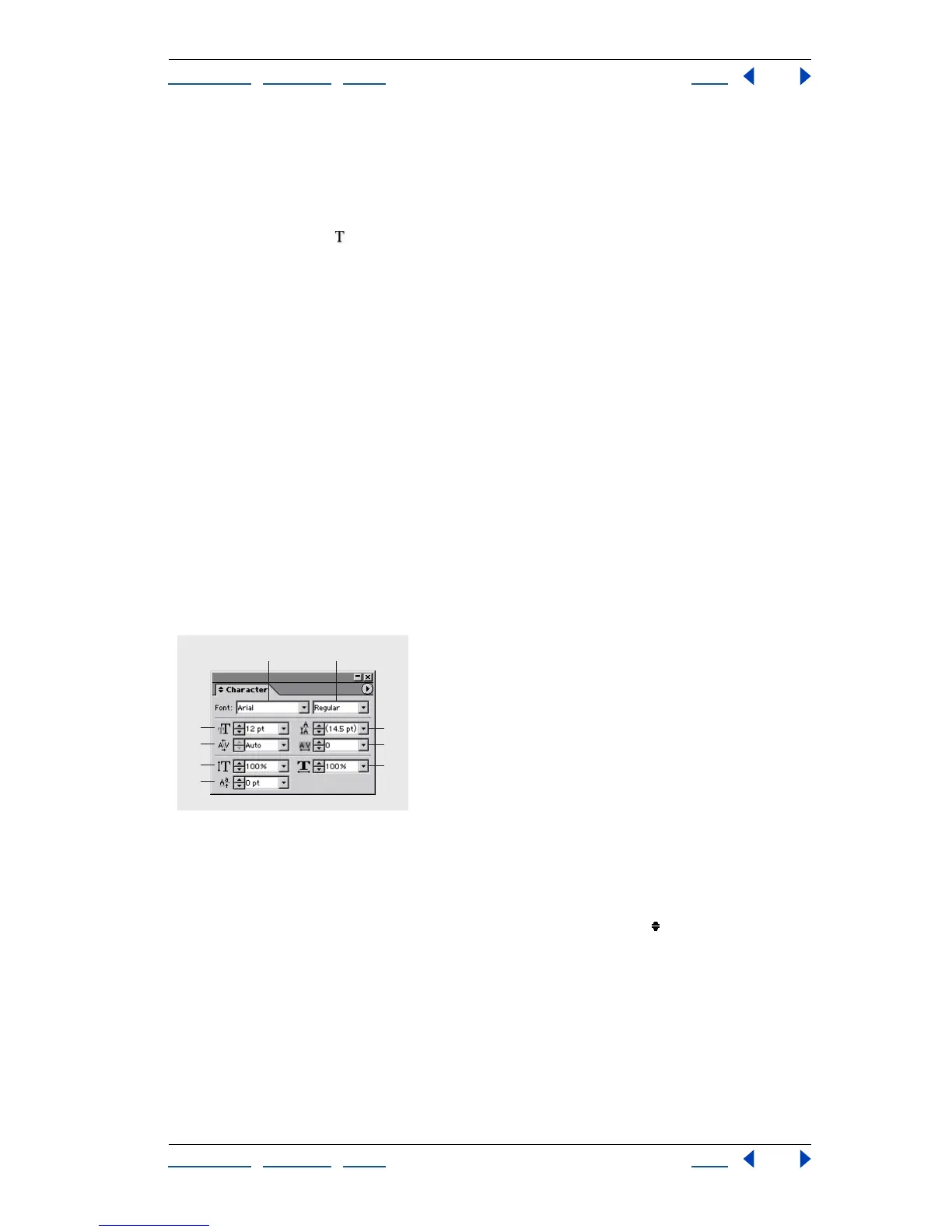 font, type size, leading, kerning, tracking, baseline shift, horizontal and vertical scale,