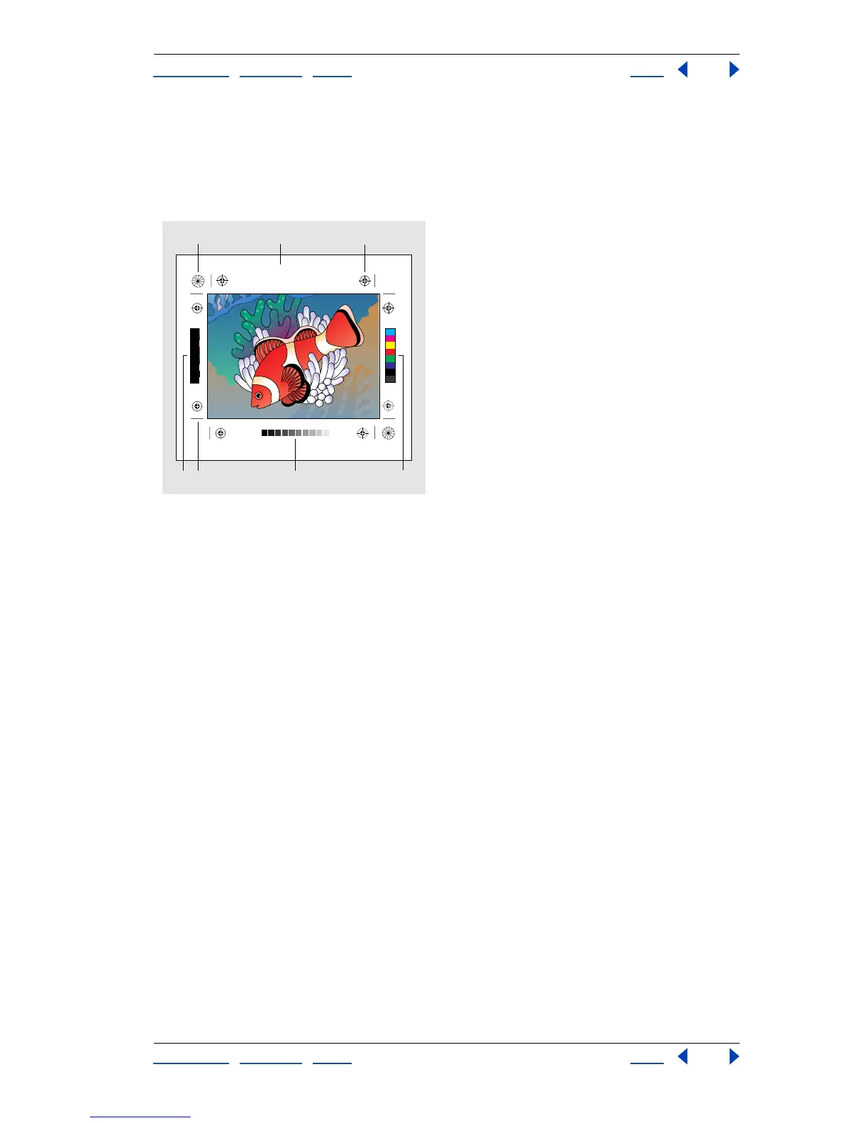 elements such as crop marks, registration marks, star targets, calibration bars, and labels.
