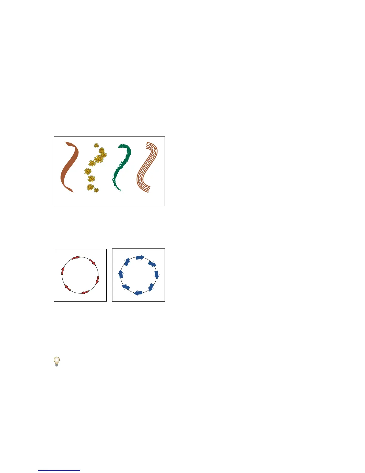 Arrows in a Pattern brush bend to follow the path (left), but arrows remain straight in a Scatter brush (right).