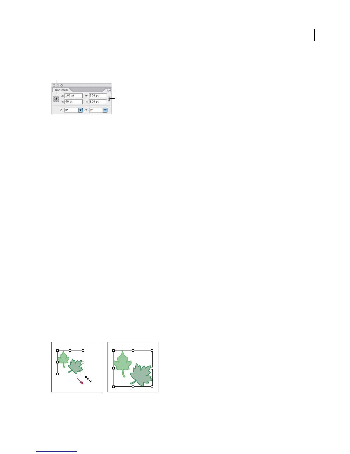 • To transform patterns but not objects when using a transform tool, hold down the tilde key (~) while dragging.