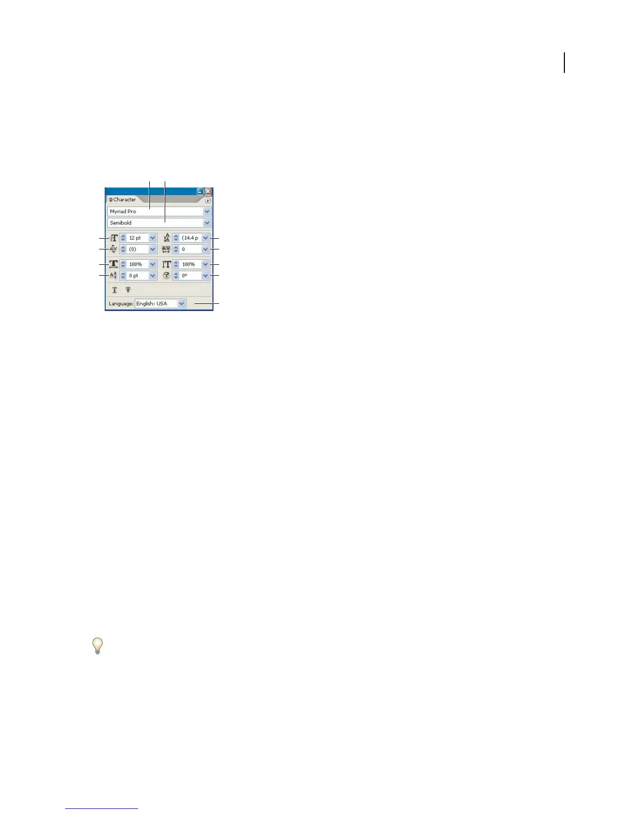 To setanoptioninthe Characterpalette, choose avalue from thepop-upmenuonthe rightsideofthe option.For