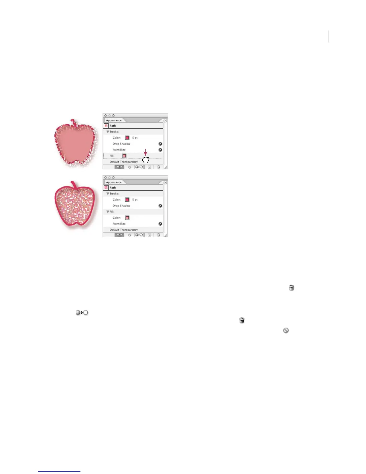 • To remove a specific attribute, select the attribute in the Appearance palette, and click the Delete icon . Alter-