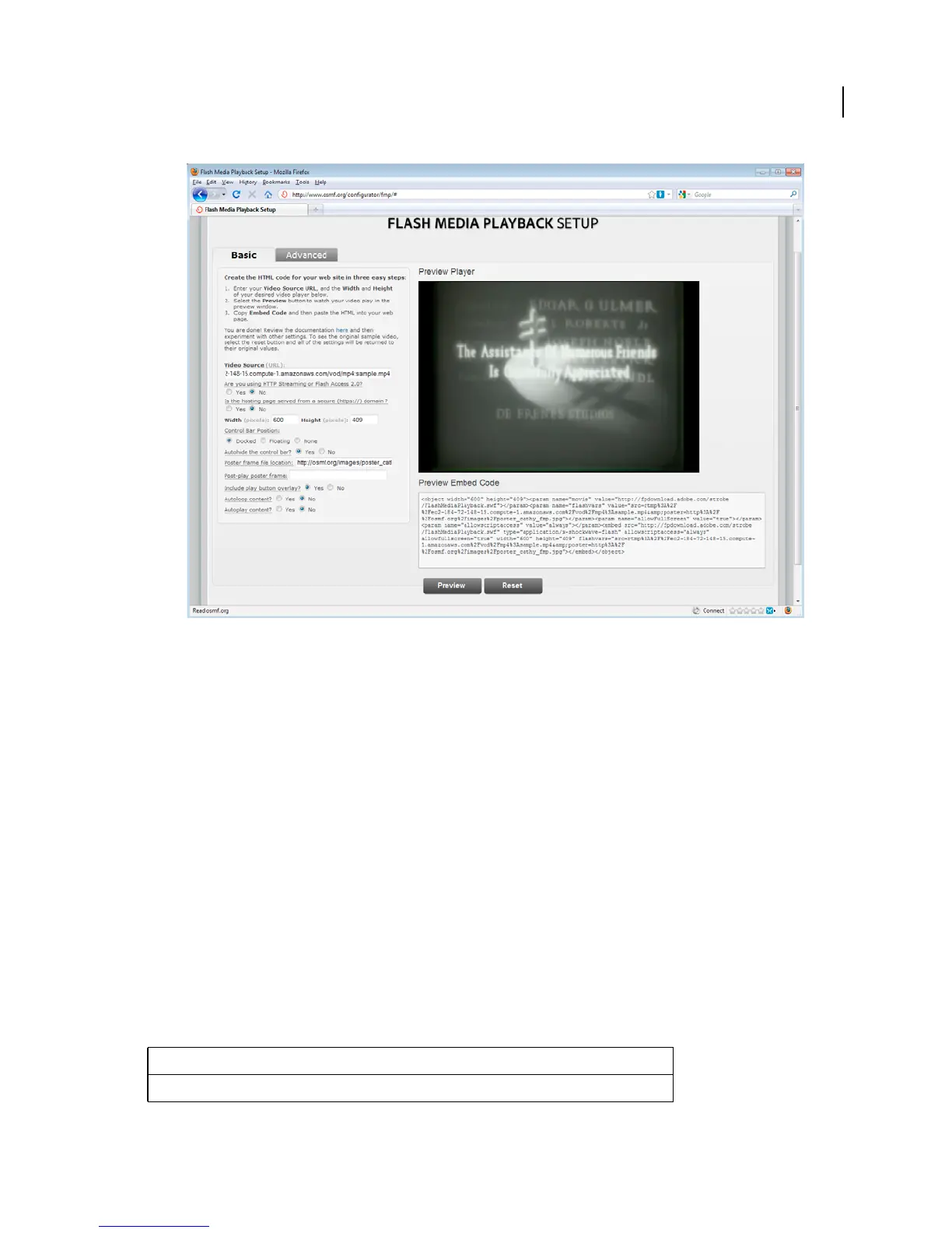 Flash Media Playback Setup page. Copy and paste the Preview Embed Code into an HTML page to use the video player. The video player