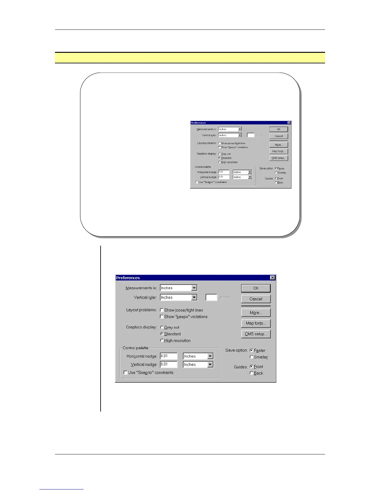 • This dialog box allows you to create defaults for how PageMaker will treat