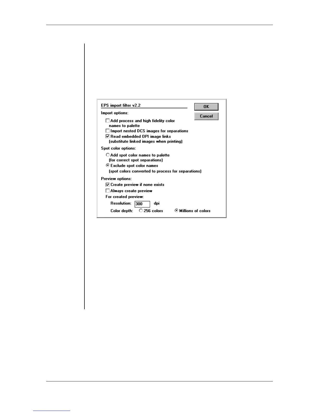 • In the EPS Import filter dialog box, select preview options you want to