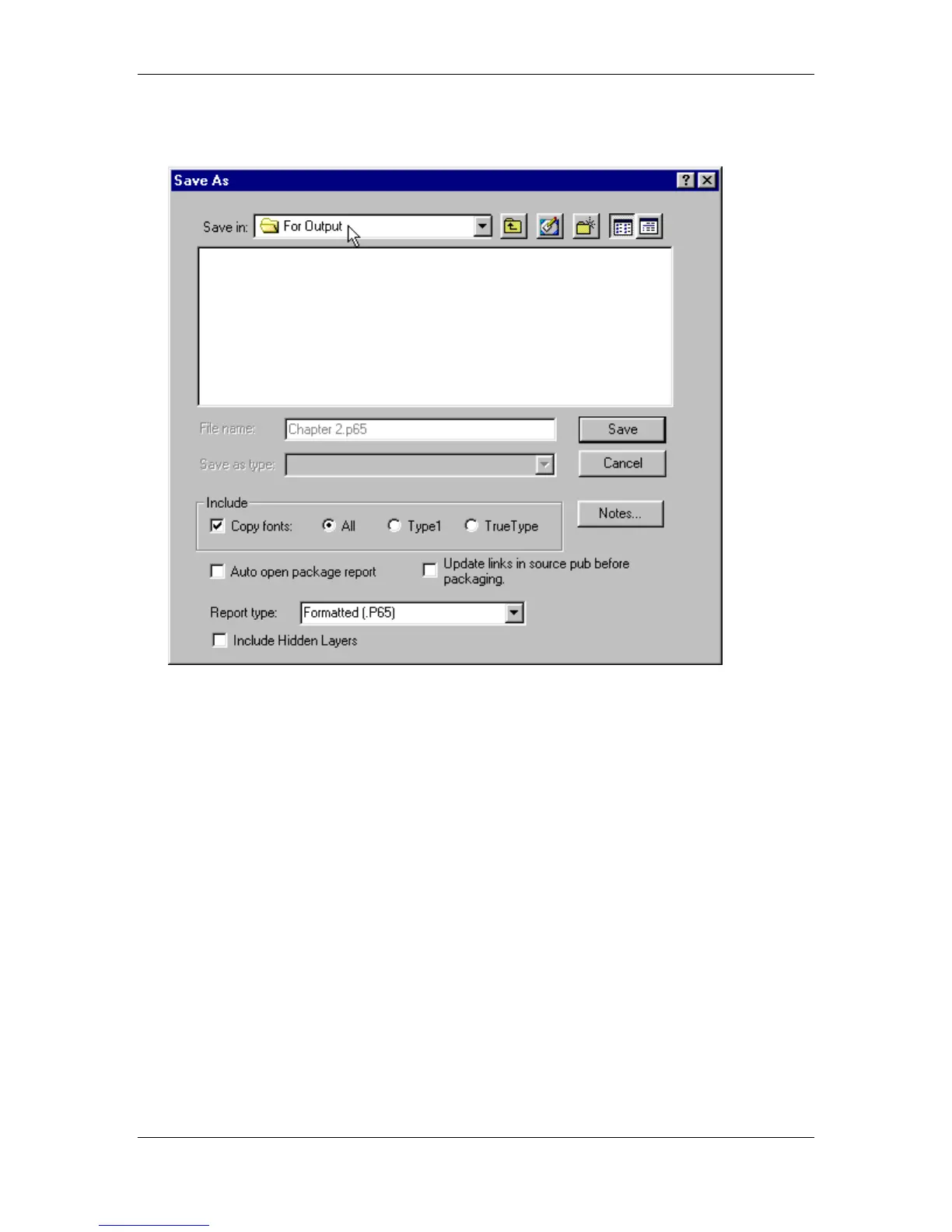 • Specify the For Output folder in the PageMaker 6.5 Advanced Work Folder as the location
