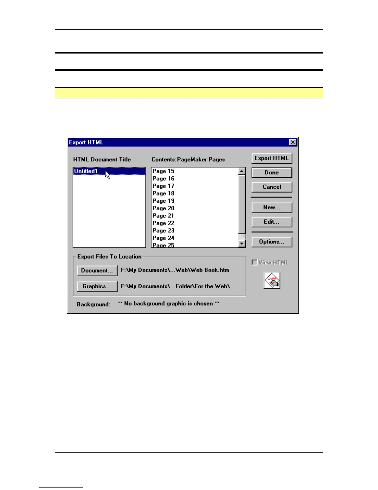• In the Export HTML dialog box, select the Untitled1 HTML Document Tile to display the