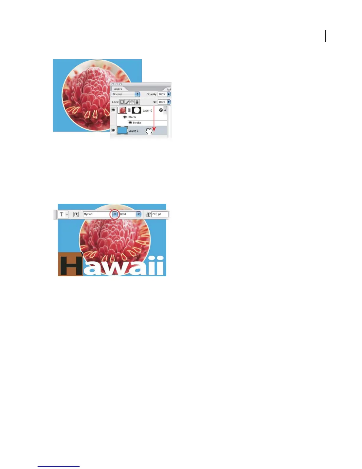 In the Layers palette, click the top layer. Select the Text tool, and then click in the image. The I-beam cursor appears.
