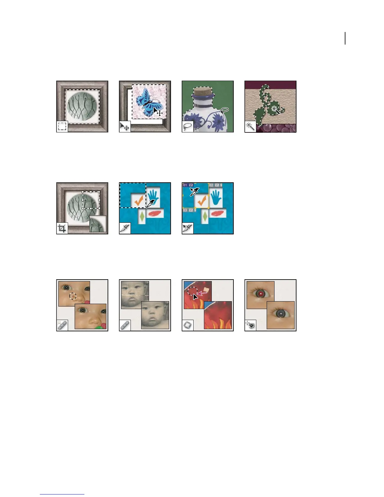 The marquee tools make The Move tool moves selec- The lasso tools make free- The Magic Wand tool selects