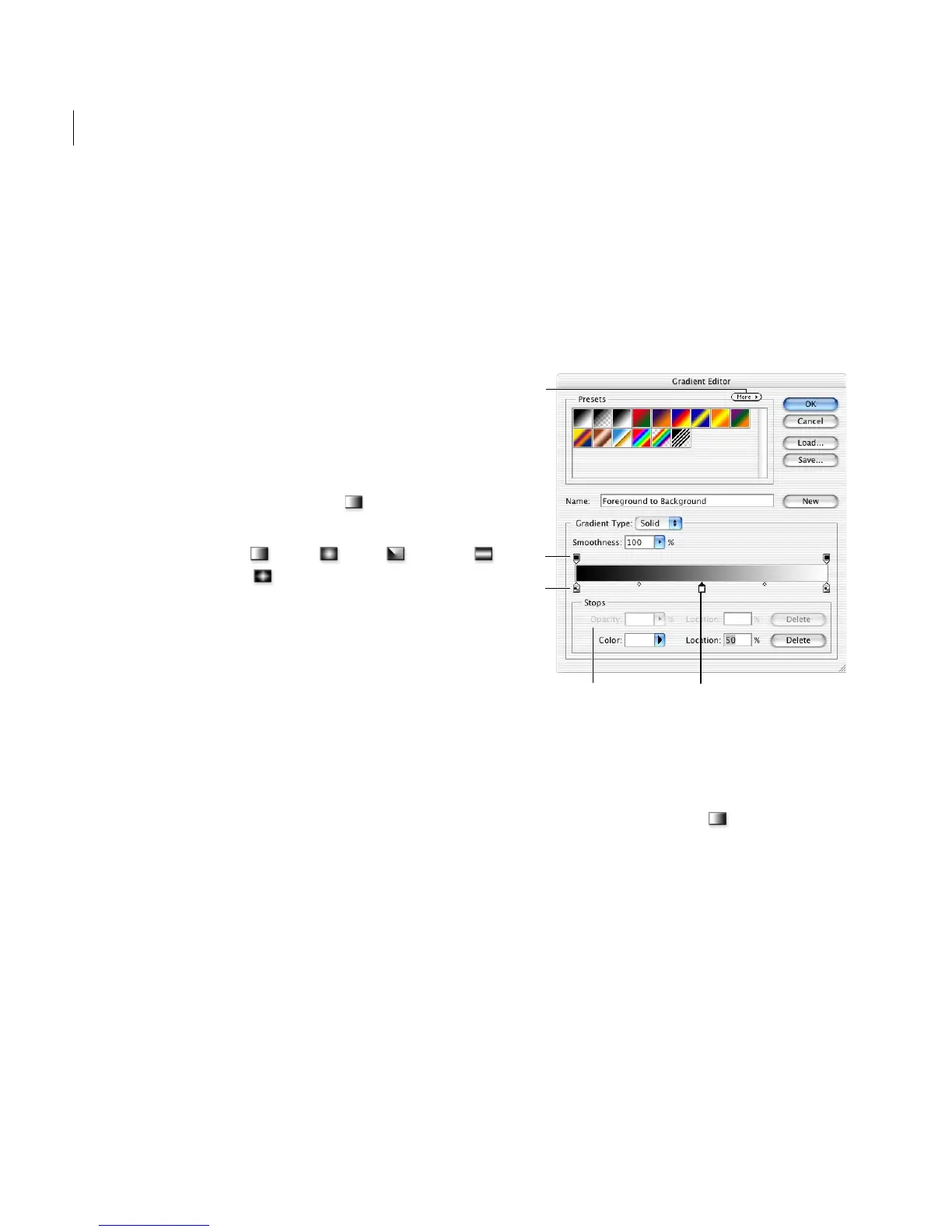 A. Palette menu B. Opacity stop C. Color stop D. Adjust val-