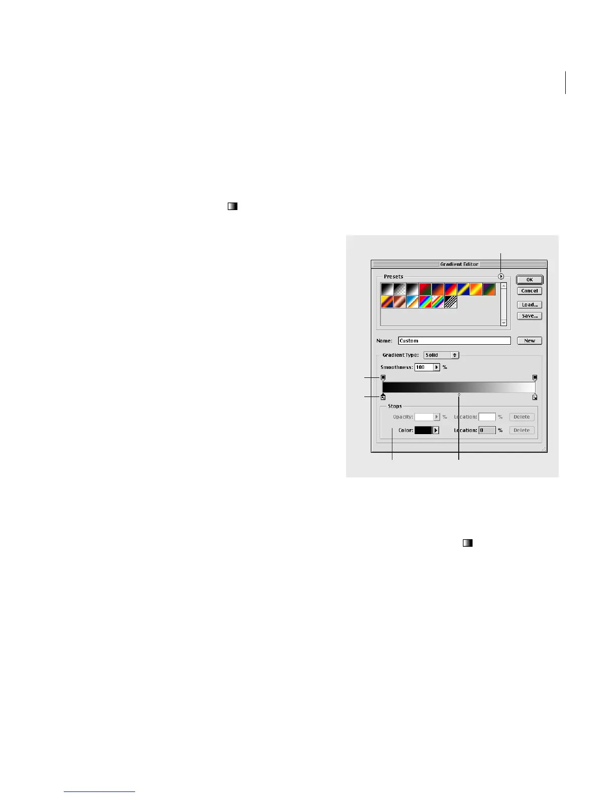 A. Palette menu B. Opacity stop C. Color stop D. Adjust val-