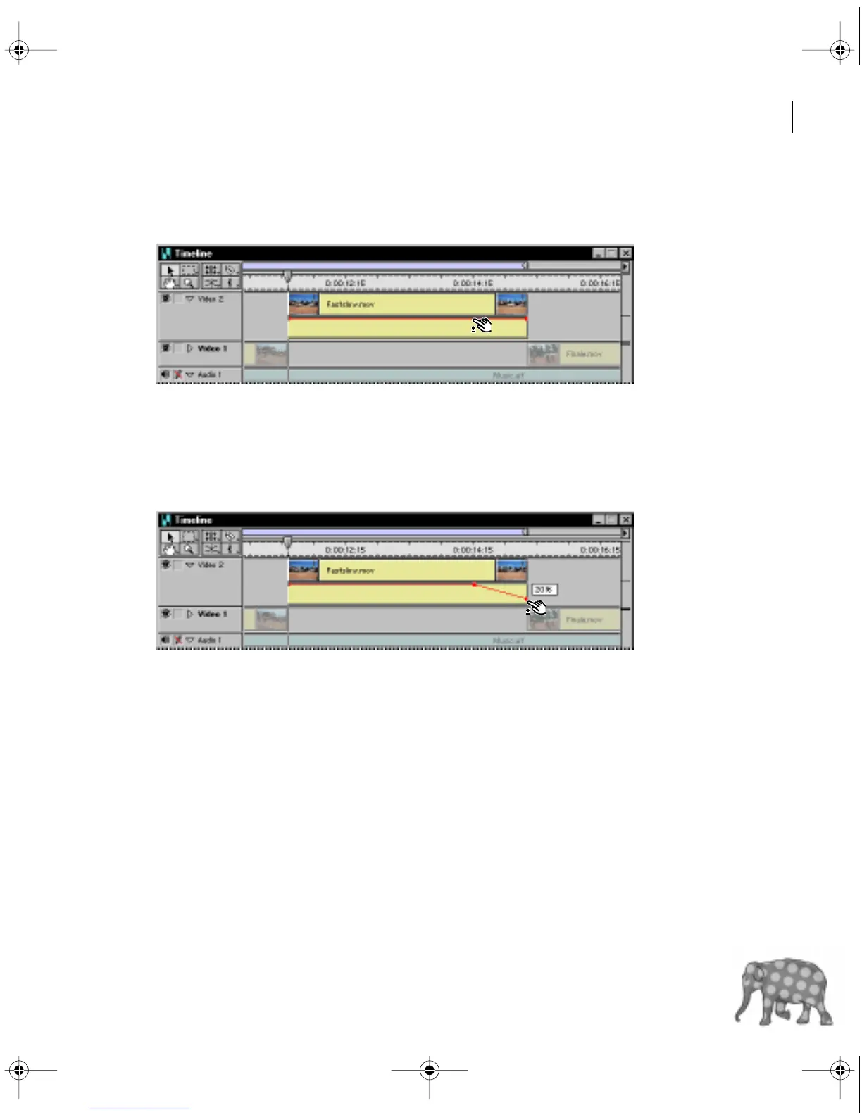 3 In the Video 2 track of the Timeline window, click the rightmost handle. Keep the mouse