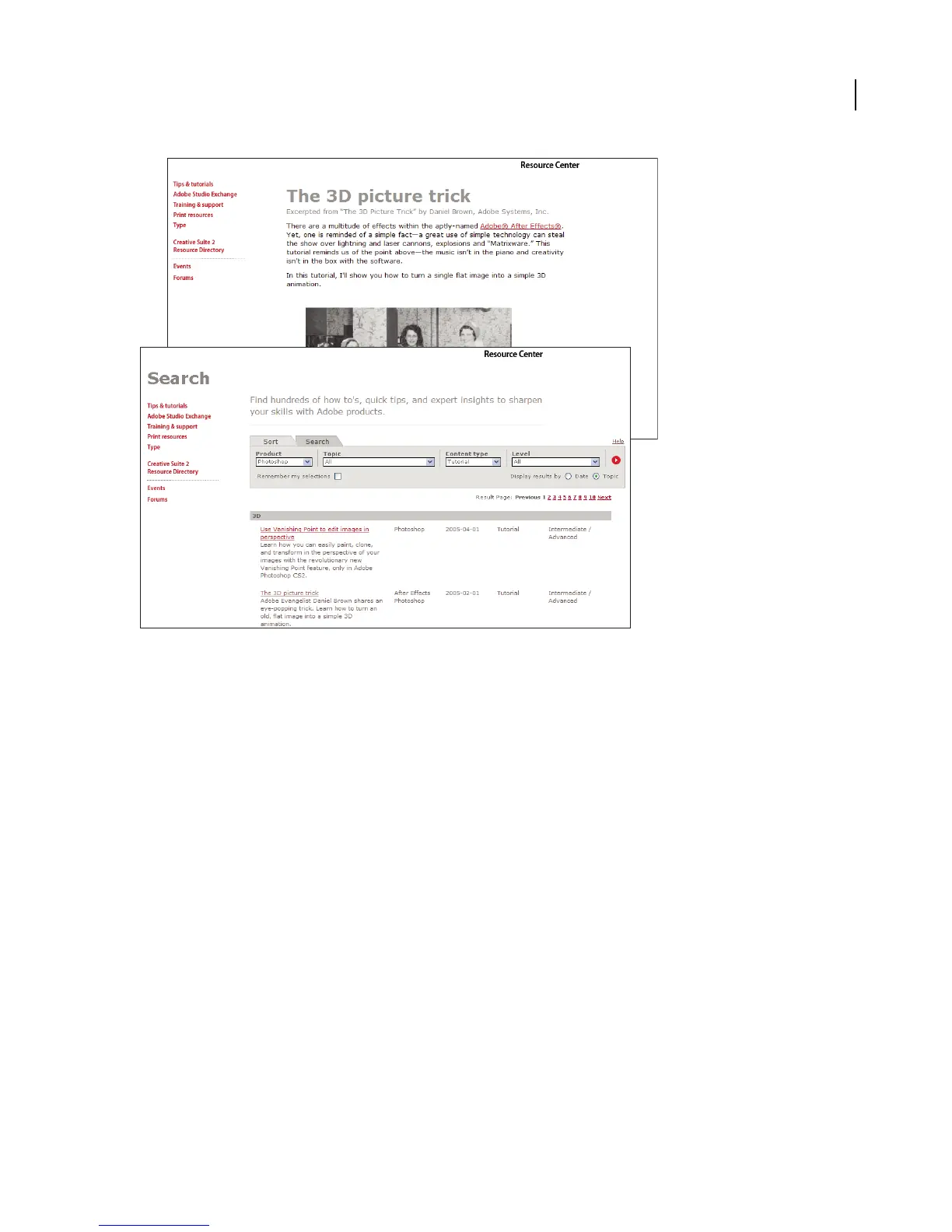 • Visit the Training area of the Adobe website for access to Adobe Press books; online, video, and instructor-led