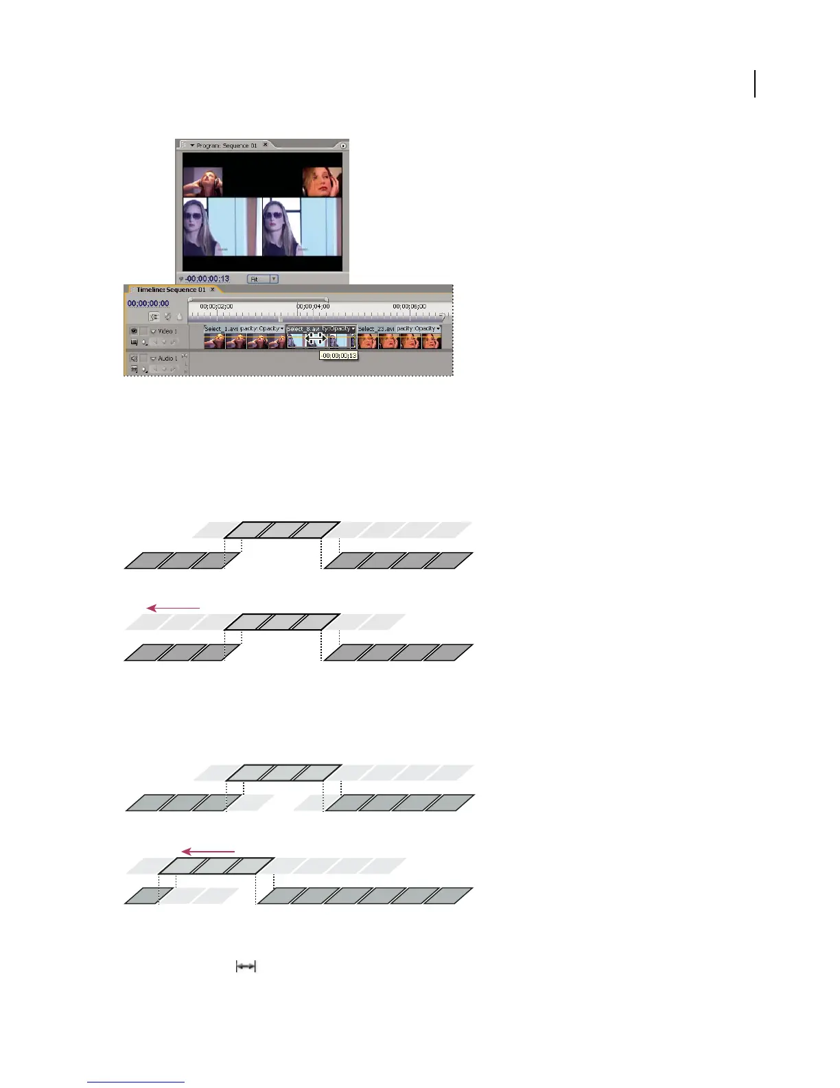 right with the Slide tool, the Out point of the preceding clip and the In point of the following clip are trimmed by the
