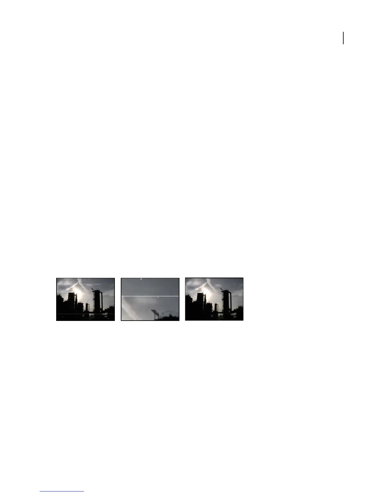 Dust & Scratches effect: Original image with scratches (left), enlarged view of scratches (center), and scratches removed with loss of clarity
