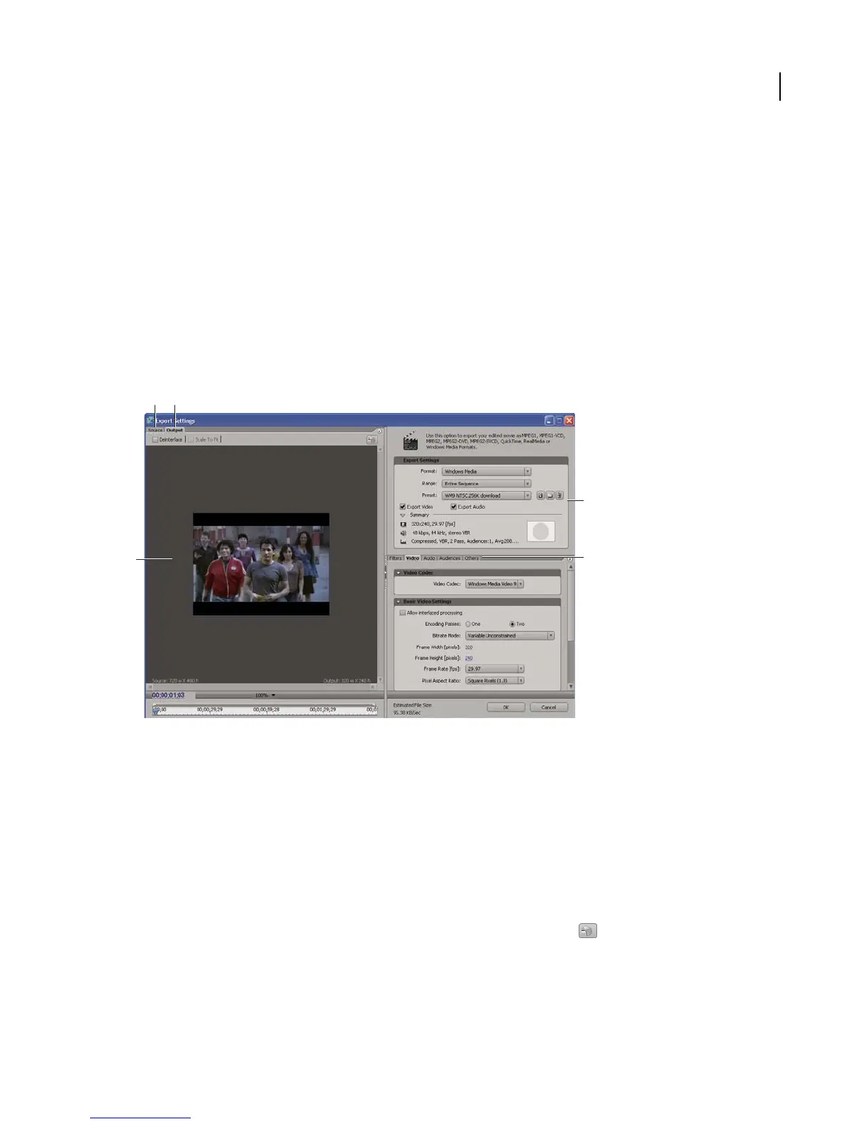 to deinterlace the frames, crop the image, or apply certain filters. Through the Export Settings dialog box, the Adobe