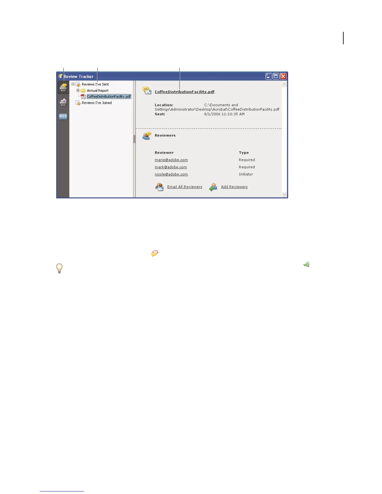 A. Review Tracker icon B. Reviews you initiated or received C. Information for the selected review
