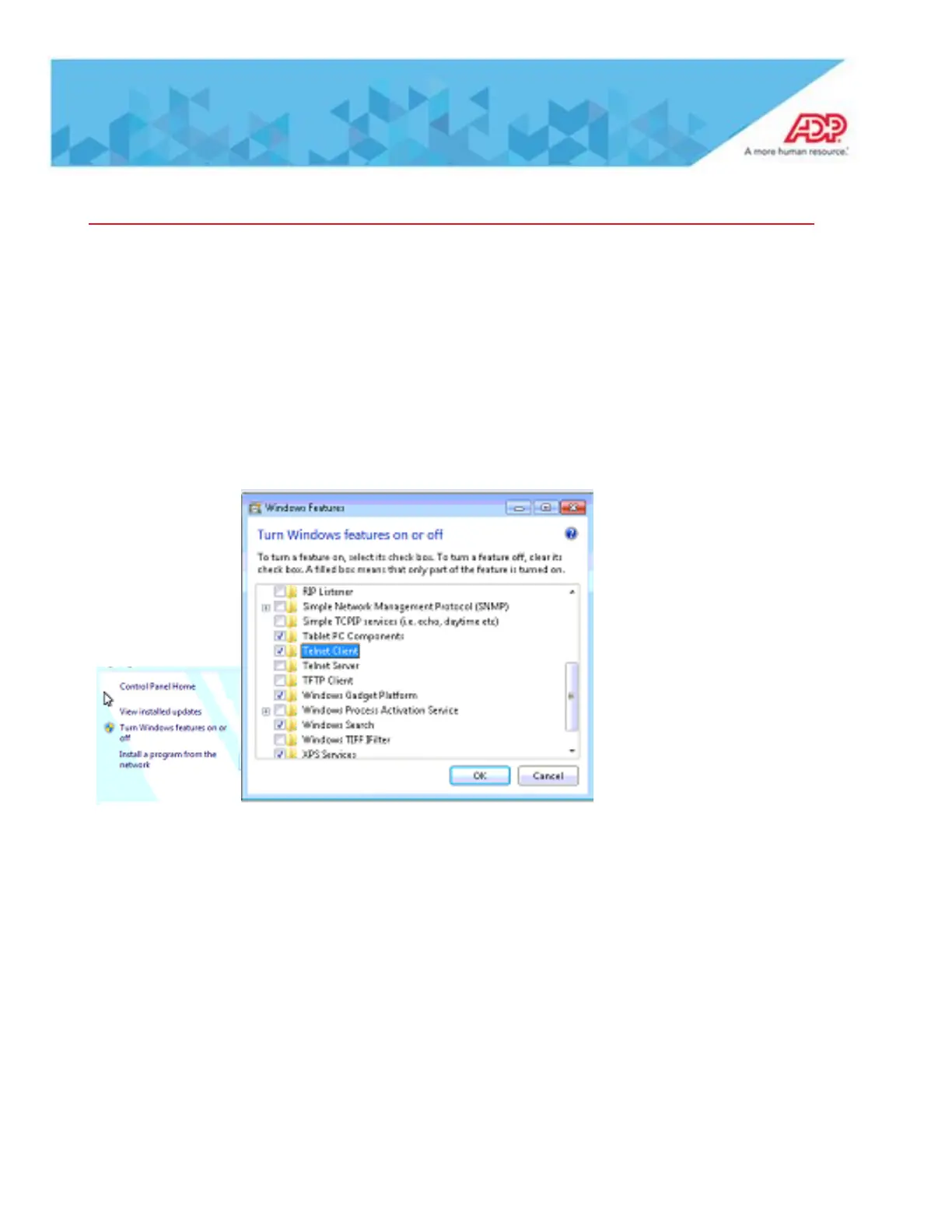 Scroll Down to Telnet Client and check box next to it