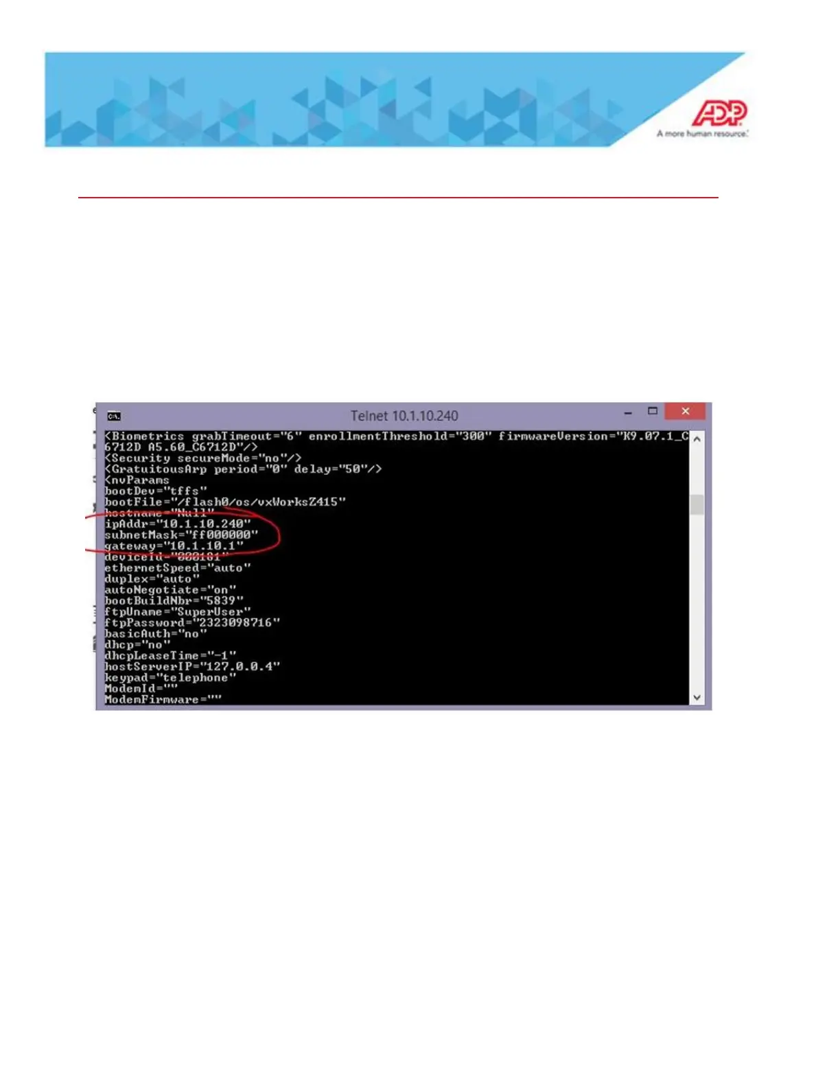 When using the TELNET command devConfigShow at a 4500 series time clock, the subnet