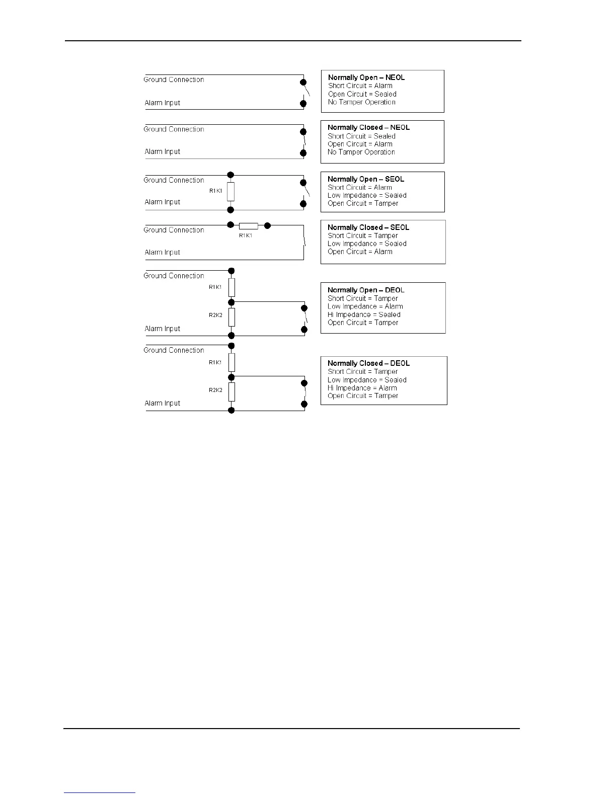 • For an open contact to be valid the resistance presented at the alarm input must be above