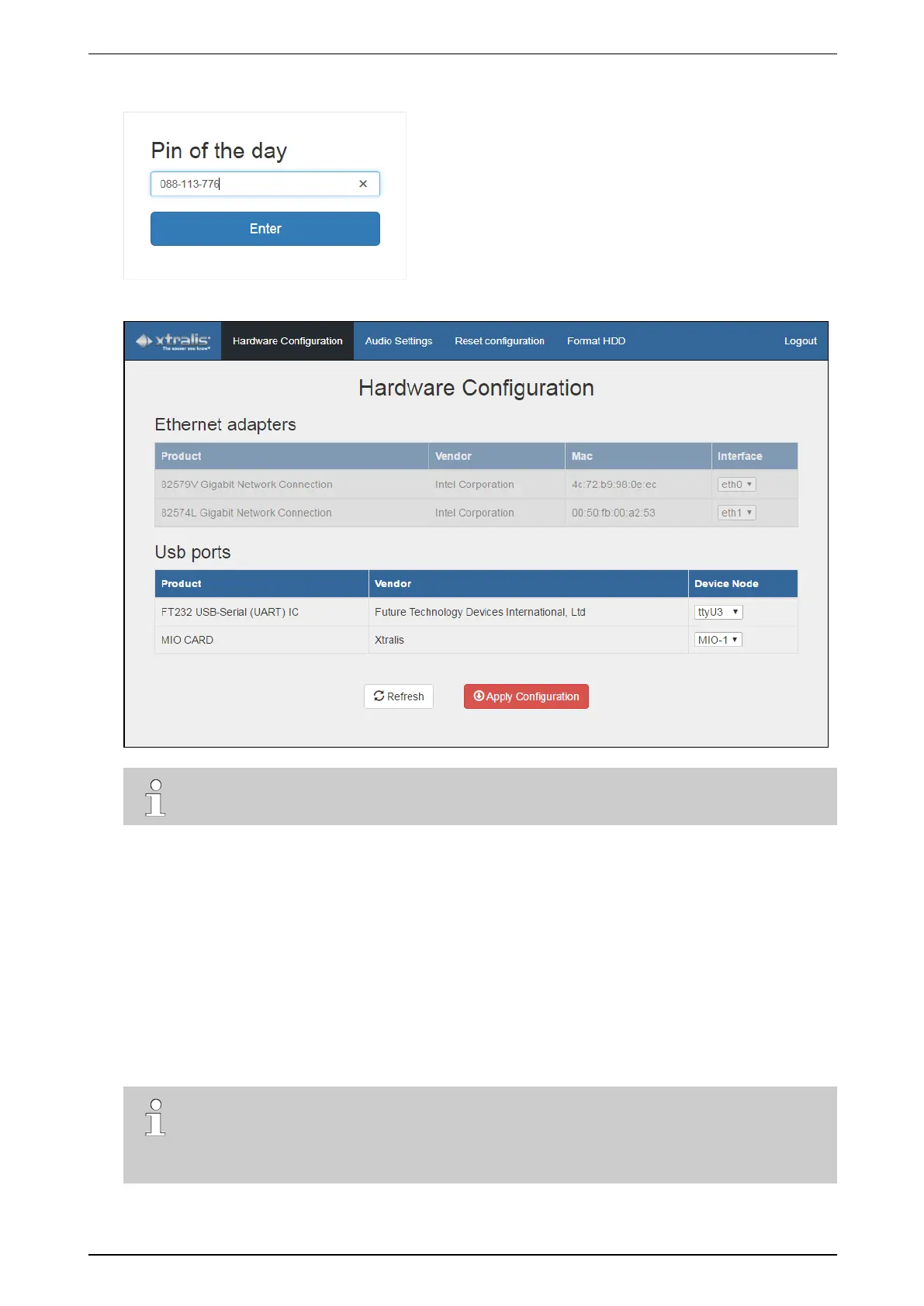 TheUsb ports listshowsthecurrentlyconfiguredUSBports(Device node column):MIO-1isthefirstMIOcard