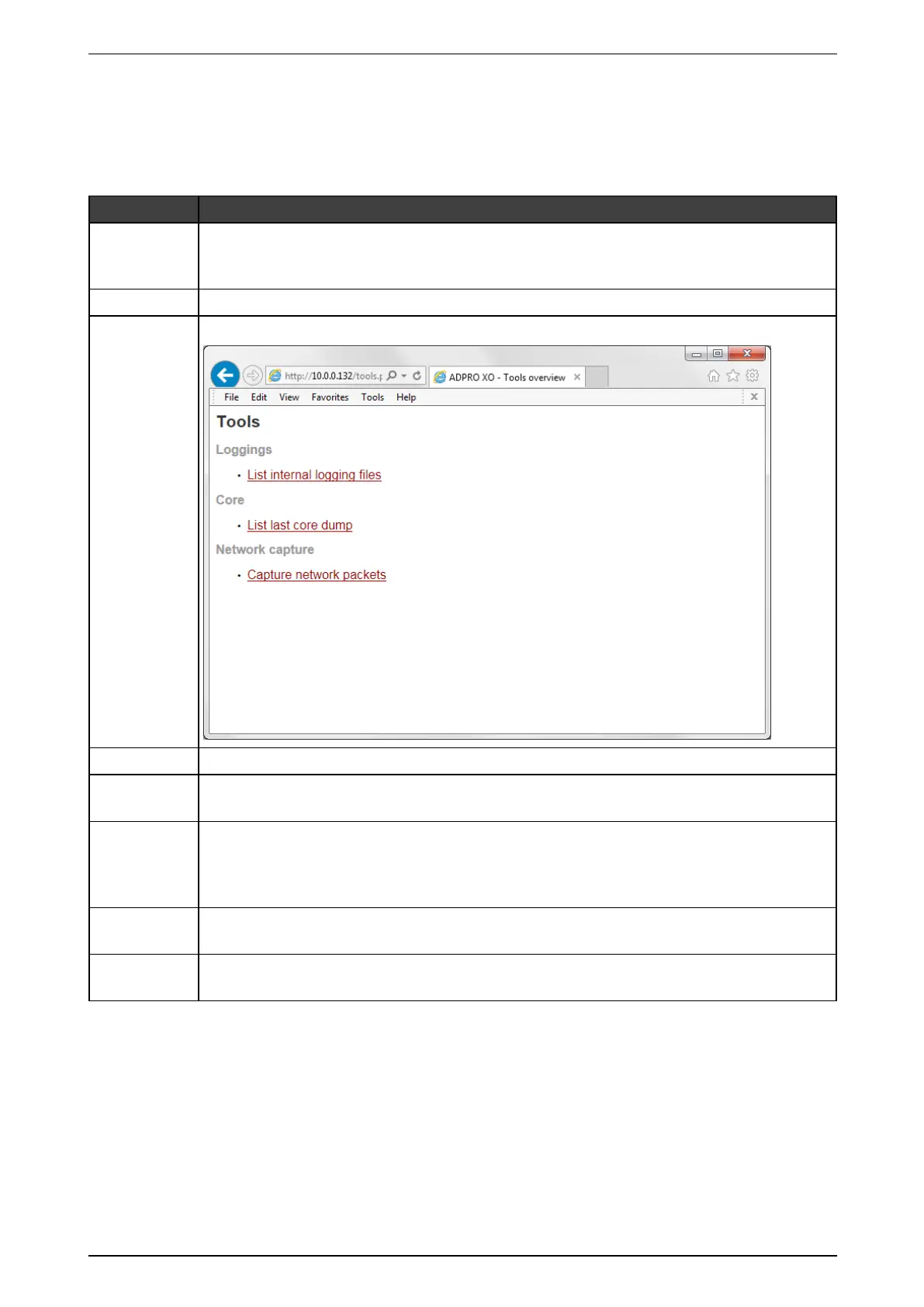 tools.php Thispagecontainsthelinkstotheinternallogging,thecoredumpandthenetworktrace: